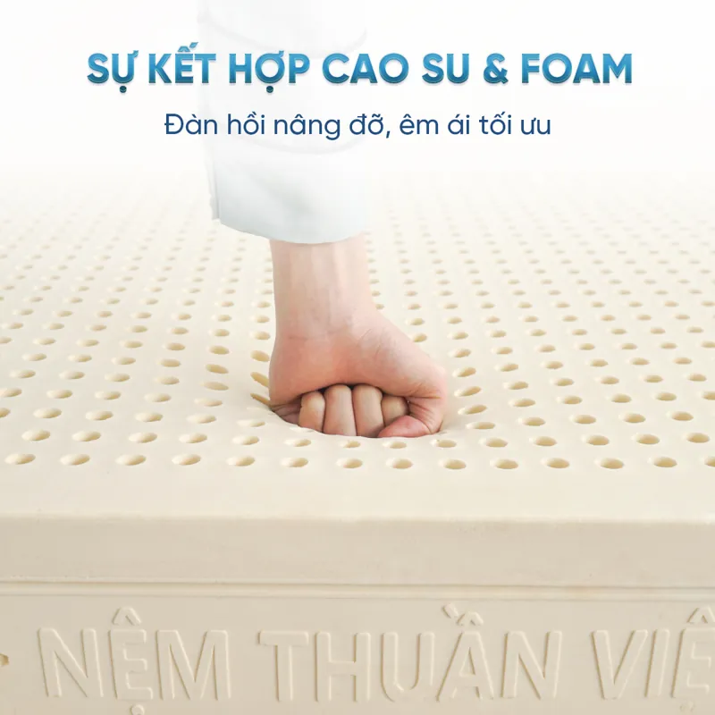 Nệm cao su Thuần Việt Legend được làm từ cao su thiên nhiên và lõi foam cao cấp mang đến cảm giác đàn hồi êm ái vừa đủ nhưng không quá lún phù hợp với những người thích nằm nệm cứng.