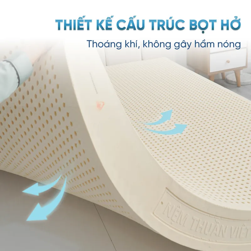 Cấu trúc thiết kế đặc biệt và thông minh với hơn 10.000 lỗ tròn nhỏ, nệm giúp cho không khí dễ dàng lưu thông, tránh tình trạng nóng nực và hầm bí khi nằm. Thiết kế thông minh này giúp bạn tận hưởng được giấc ngủ dễ chịu và thoải mái. Với sự thông thoáng, nệm cao su Thuần Việt Legend chắc chắn là sự chọn lựa tuyệt vời cho giấc ngủ sâu giúp thúc đẩy sức khỏe tổng thể cho gia đình bạn.