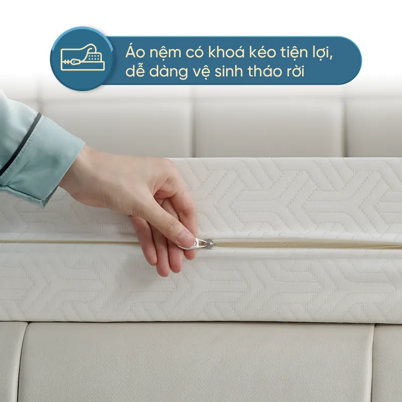 Lớp áo nệm được làm từ vải gấm nhung cao cấp, dập hoa văn nổi tinh tế, gam màu trắng thêm phần thanh lịch, sang trọng và hiện đại. Chất vải mềm mịn ôm sát với thân nệm có tính hút ẩm cao, khả năng thấm hút mồ hôi rất tốt tạo cảm giác thoáng mát. Đặc biệt, thiết kế có dây kéo khóa có thể tháo rời để bạn vệ sinh một cách dễ dàng.