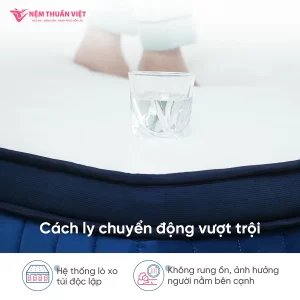 Từng con lò xo trong nệm được đặt trong túi riêng biệt, giúp giảm thiểu rung động khi di chuyển, ngăn ngừa tiếng ồn, và tạo sự thoải mái tuyệt đối cho cả hai người nằm trên nệm.