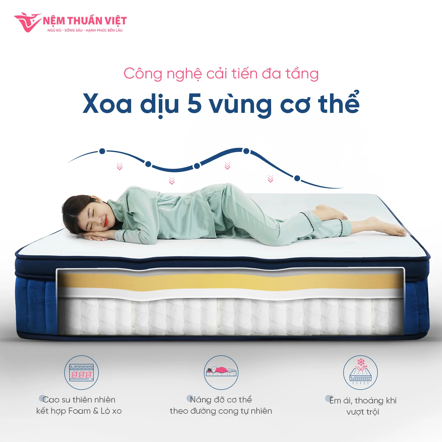 tôi được tư vấn mua nệm này vì độ cứng vừa phải đỡ bị đau lưng, quả thật rất hài lòng về tấm nệm này, ứng dụng cộng nghệ aircool gì đó nằm mát lắm ko hầm bí. tôi sẽ tiếp tục ủng hộ nệm thuần việt