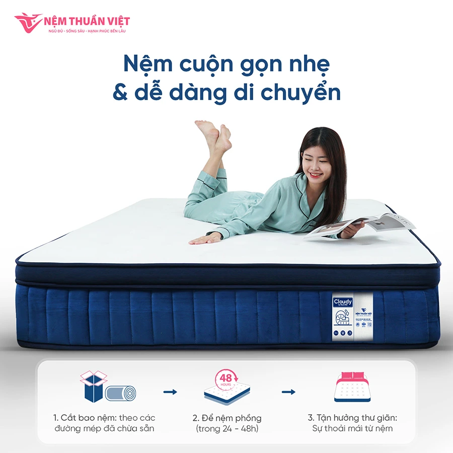 Nệm lò xo Thuần Việt Cloudy được thiết kế với khả năng ép cuộn hút chân không, giúp dễ dàng vận chuyển và bảo quản mà không làm ảnh hưởng đến chất lượng và độ bền của sản phẩm.