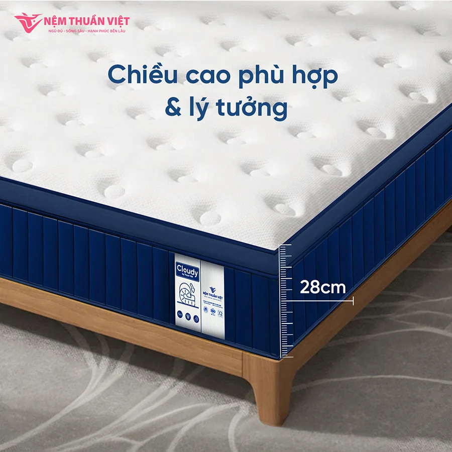 Với độ dày 28cm, nệm Lò Xo Thuần Việt Cloudy là sự lựa chọn lý tưởng cho những ai thích nằm nệm cao, nâng đỡ thoải mái tối đa. Nổi bật với thiết kế đẳng cấp, Cloudy không chỉ là biểu tượng của sự sang trọng mà còn là lựa chọn hoàn hảo cho những người có gu thẩm mỹ tinh tế, mong muốn tìm kiếm một “siêu phẩm nghỉ dưỡng” 5 sao ngay tại chính căn phòng của mình.